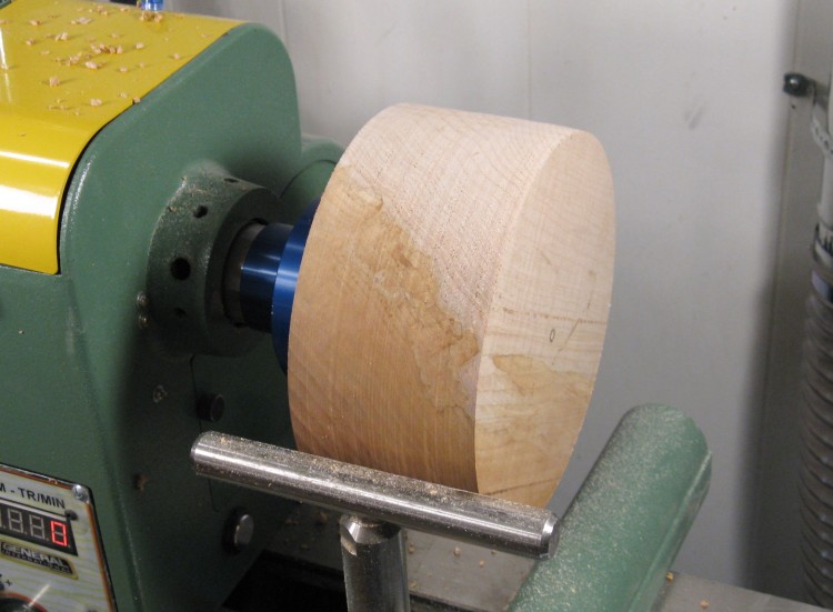Here the wood has been mounted to the lathe and all those funky outside corners have been removed to leave a nice round shape.