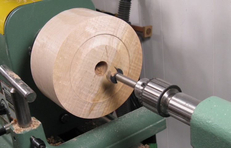 When hollowing a bowl, getting the wood out of the center part is often difficult since it is moving so slowly. Typically a hole is drilled to get rid of the wood in the middle as shown here.