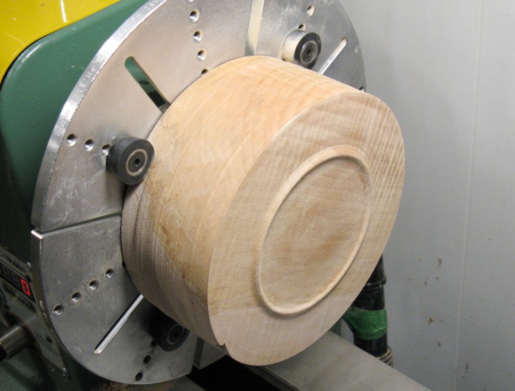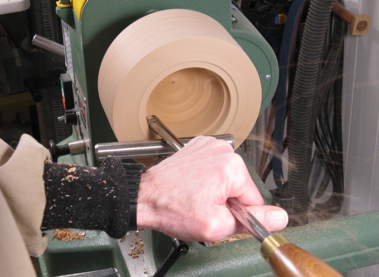After the inside was done, I flattened the bottom as shown here before taking it off the lathe.