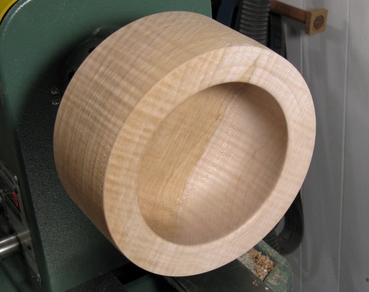 At this stage, the inside of the bowl has been completed. Figured maple can be a difficult wood to work with due to odd grain orientations. I had a bit of tear-out in the interior where tiny bits of wood literally tear out and leave divots rather than producing a nice thin shaving. This took some attention in the form of scraping and sanding to eliminate, but in the end it looked fine.