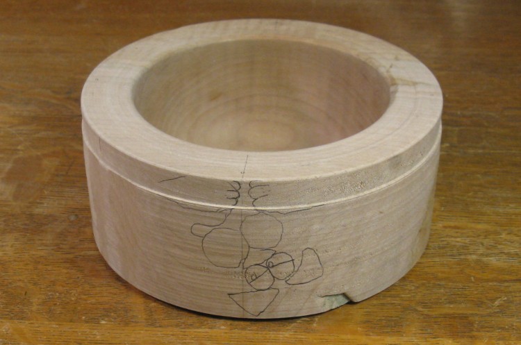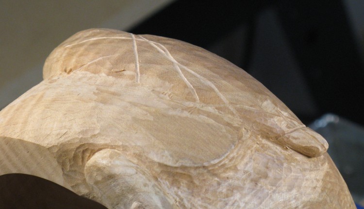 The turning is finished at this point, so I started looking at moving on to the carving, beginning with the face. Here the outline has been transferred to the bowl.