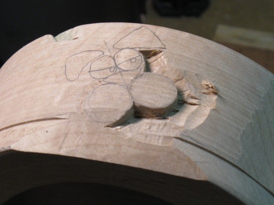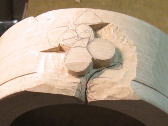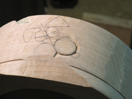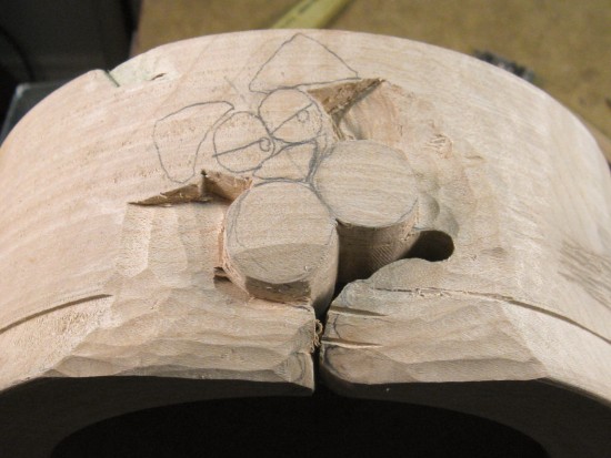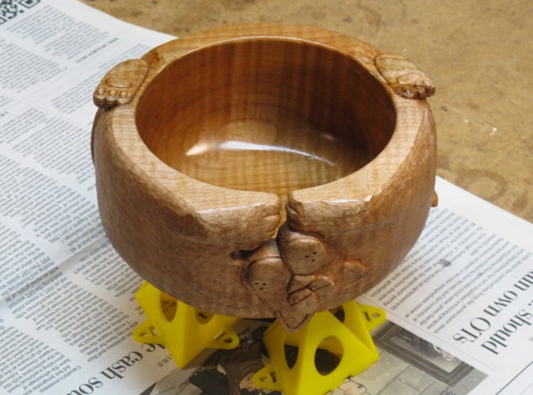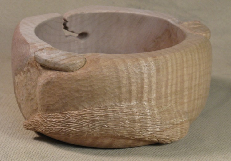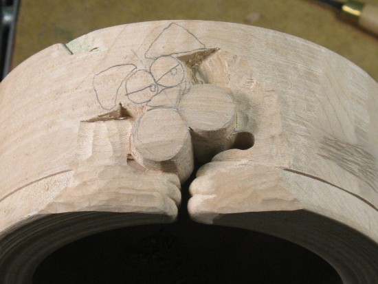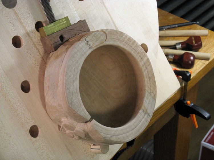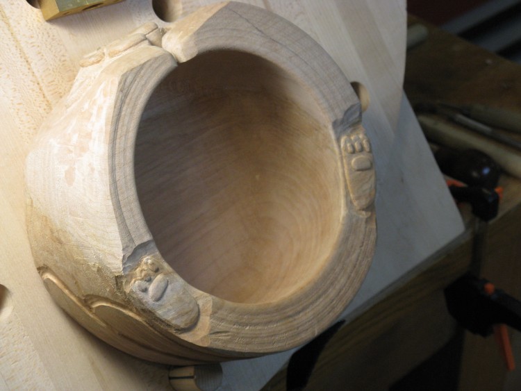 I moved the bowl over to a carving table to make it easier to work on the top edge. At this point, the bottom paw is barely visible as a pencil outline and the top paw has been its outline defined.