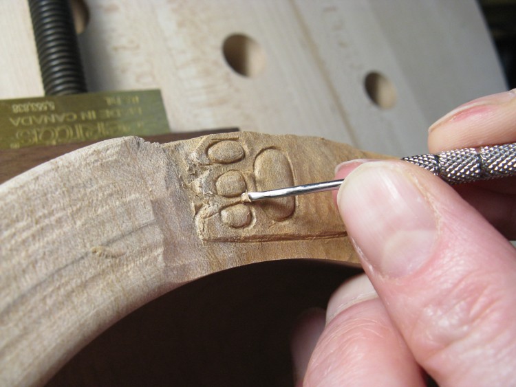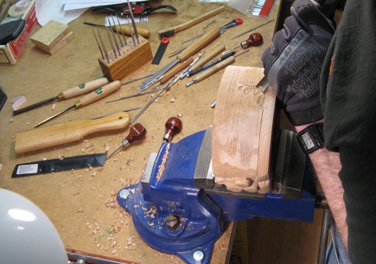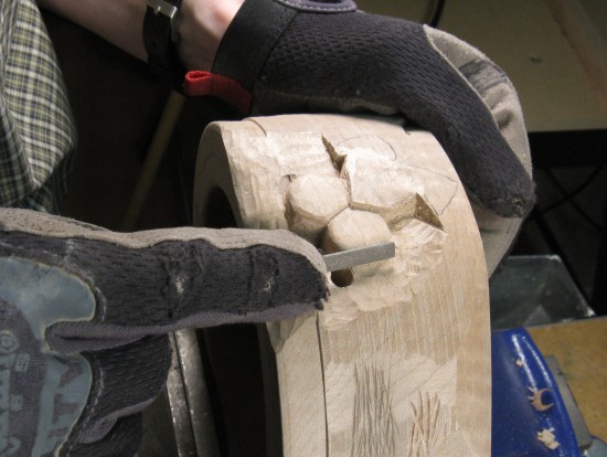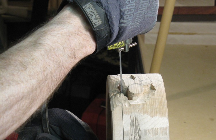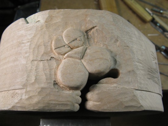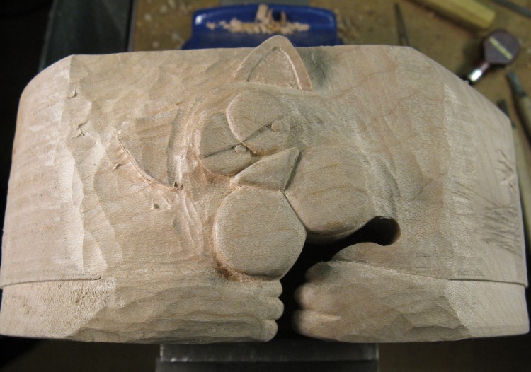 A coping saw was used to help cut out the mouth and paws, but otherwise it was mostly work with small chisels.