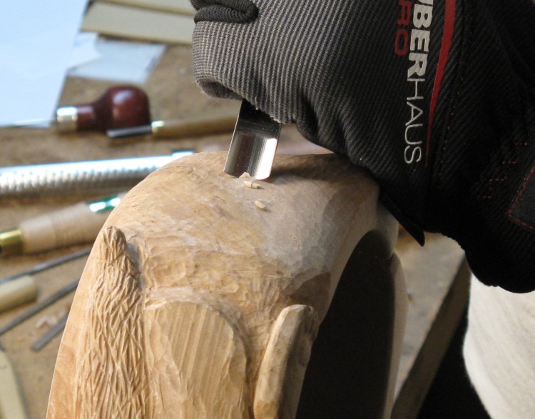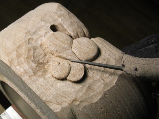I decided to make the paws a bit more interesting by including foot pads. Here the base of the paw is being carved down with a tiny chisel to define a pad.