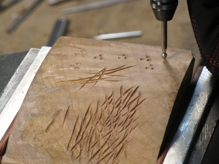 I still hadn't made the whisker dimples on the face. So here I'm checking out various grinders to find a good dimple-looking one. This is a piece of scap wood I used to check some other textures too.
