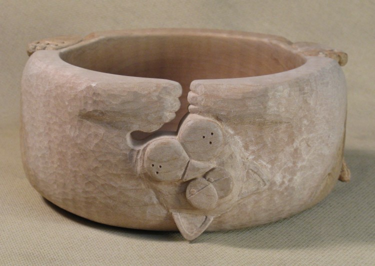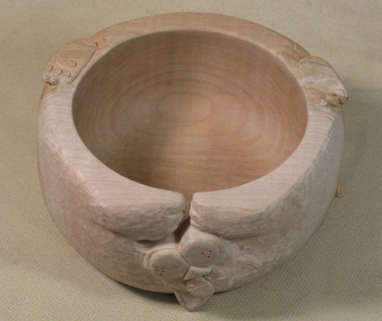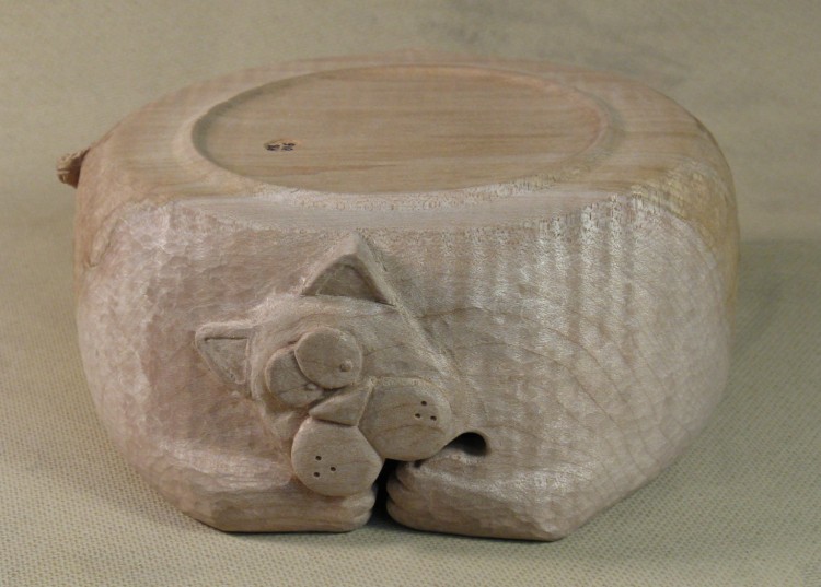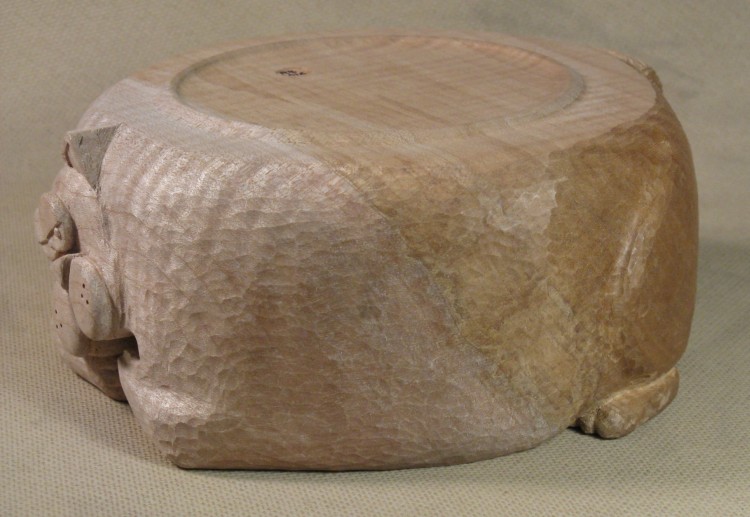 I had early on contemplated whether the bowl should be painted to bring out the features, but decided it was better to leave it in the native wood. The details like eyelids and pupils are well enough defined that paint wasn't really needed.