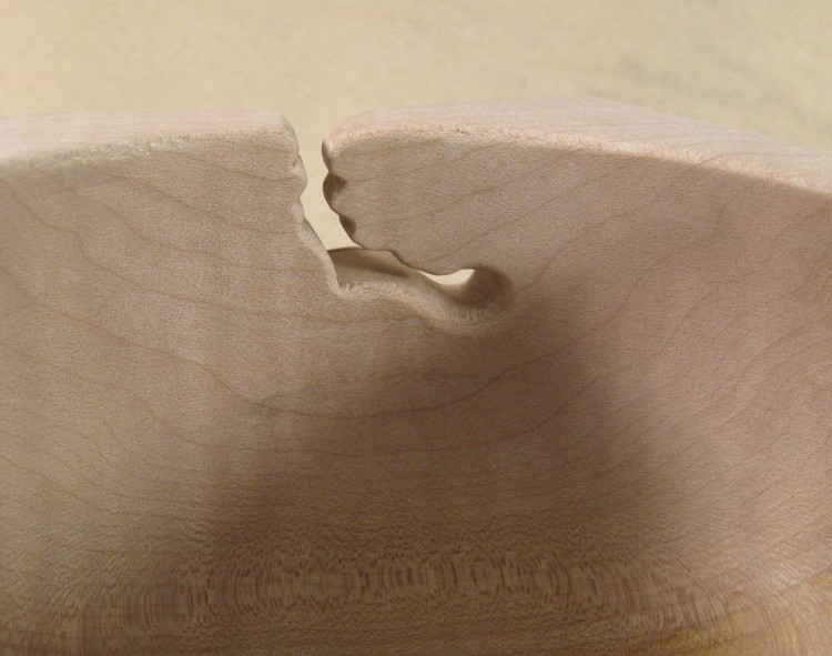The notch you can see on the lower left of the bowl is a consequence of having the wood come out of the jaws on the lathe. This happened due to a catch when clearing off the mounting block. Fortunately the notch was the only damage to the piece and it will be removed as the bowl is shaped.
