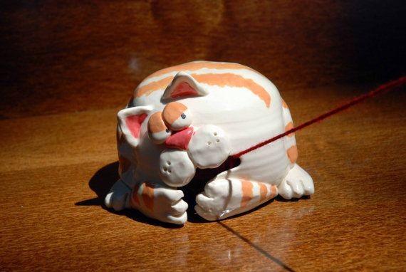 My skills don't stretch to drawing animals so I looked around for designs that I thought might be appropriate. I found a nice ceramic yarn "bell" with a comic cat that looked like it was trying to grab the yarn. I pretty much copied the face design directly but made a conventional bowl shape so that the cat was on its back.