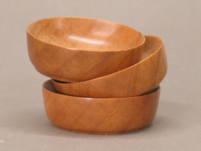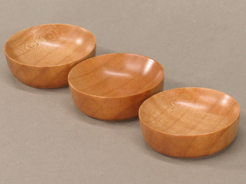 same techniques as when I made some small bowls back in 2010. Rather than "reinventing the wheel" and coming up with entirely new sentences I'll just cut 'n paste their description here: [All] were turned the same way; using double-sided tape to hold the blank to a flat plate while the inside and part of the outside was turned, then flipping around and mounting in a jam chuck to complete the bottom and bottom rim.