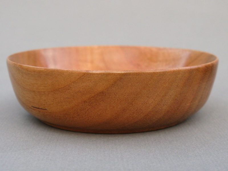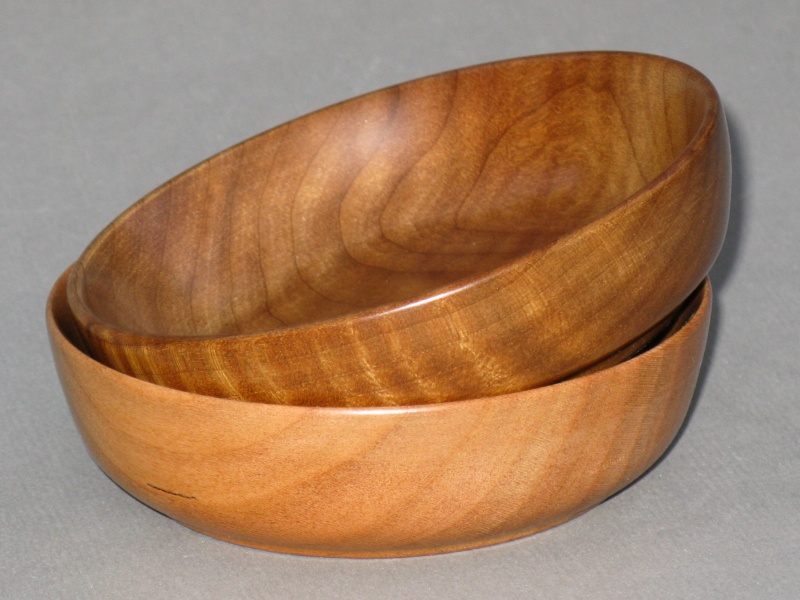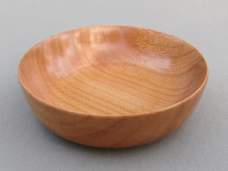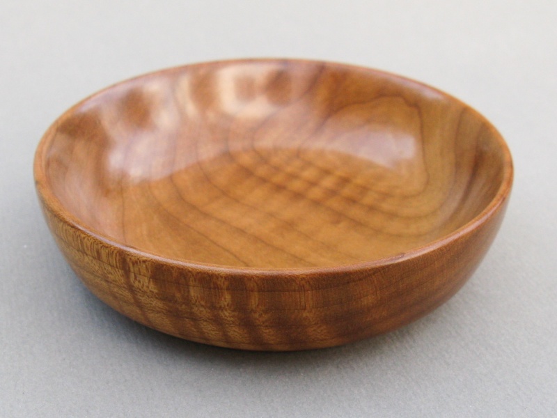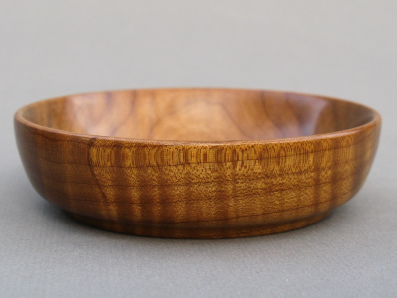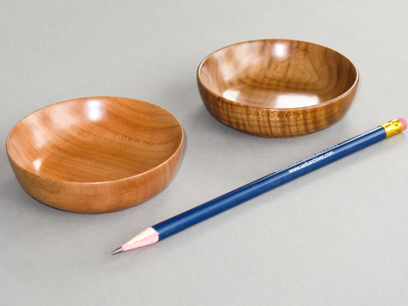 I thought I could use a couple little bowls for small snacks like nuts, so I turned these two. They were both from 1" thick wood (or "four quarters" if you want to sound like you know what you're talking about at the wood store). One of them was a plank of roasted curly maple, which was an impulse buy just because I liked the look. It has the nice curly-maple figure combined with a dark-caramel colour from the roasting process. I was quite pleased with the look of the finished bowl (it's the darker one above). Both were turned the same way; using double-sided tape to hold the blank to a flat plate while the inside and part of the outside was turned, then flipping around and mounting in a jam chuck to complete the bottom and bottom rim.
