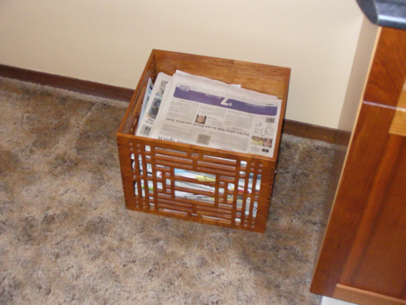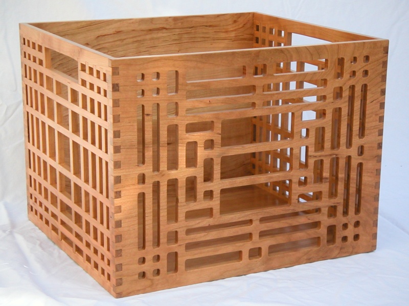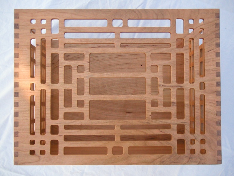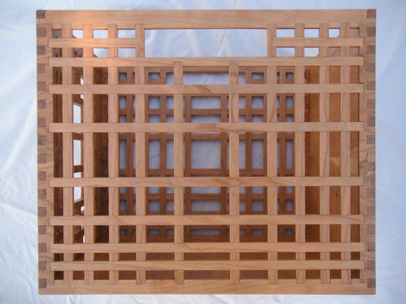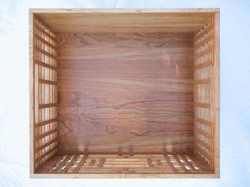 I decided to make a decorative box to hold the papers so they could stay conveniently located in the dining room. The box is made from Cherry. Front and back are each made from one piece; the back solid, the front milled out with a Frank Lloyd Wright - inspired design. The sides are multiple overlapping square rods with a linearly varying pitch, and the bottom consists of 3 plys of thin laminated cherry.