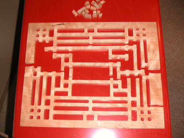 major error was putting the completed piece through the planer to thin it down. The latter action resulted in a bunch of smaller pieces. This turned out to be not too bad, since I then had the opportunity to make a better-made front wall. I was also able to use part of the original broken wall as a pattern, which sped things up considerably. On the original one, I taped down 4 guide boards for each opening to be made - a rather time-consuming process.