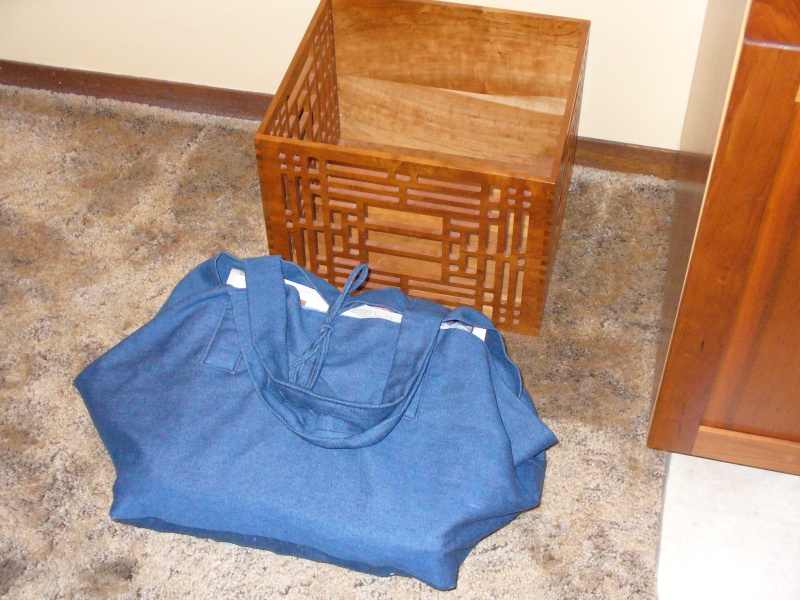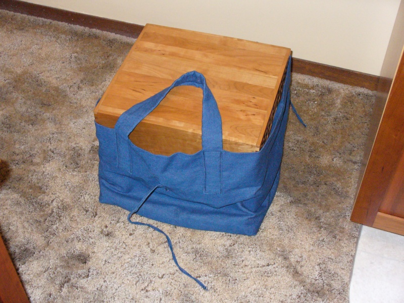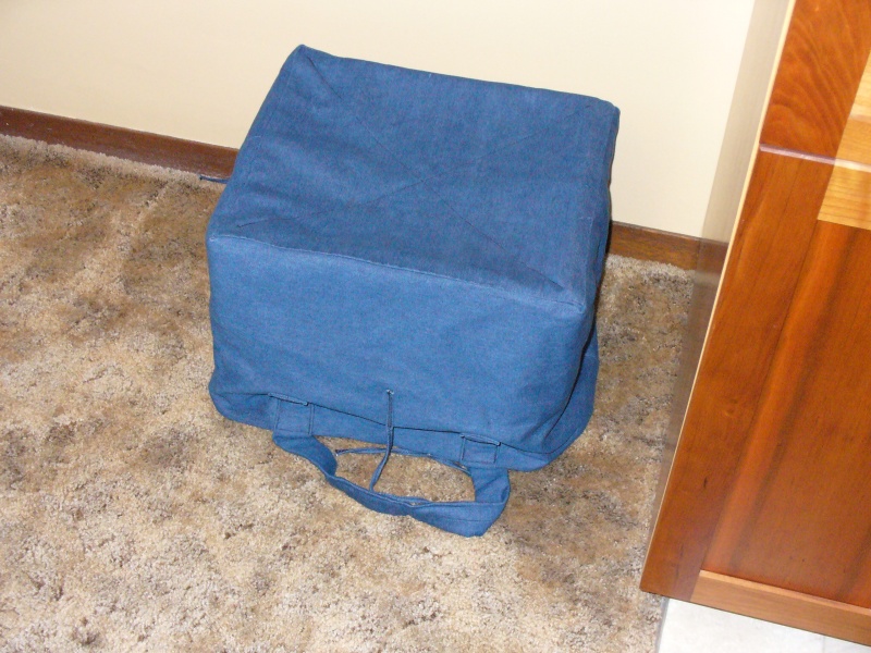 The second part of the system was a strong reusable bag to hold the paper for disposal. I made a square double-walled denim bag with handles and ties that would hold the paper for delivery to the drop-off bins. The bag was made large enough to fit over the box, so in operation, it is used to cover the full box, the box inverted and pulled out, and the ties tied together to hold the paper in the bag.
