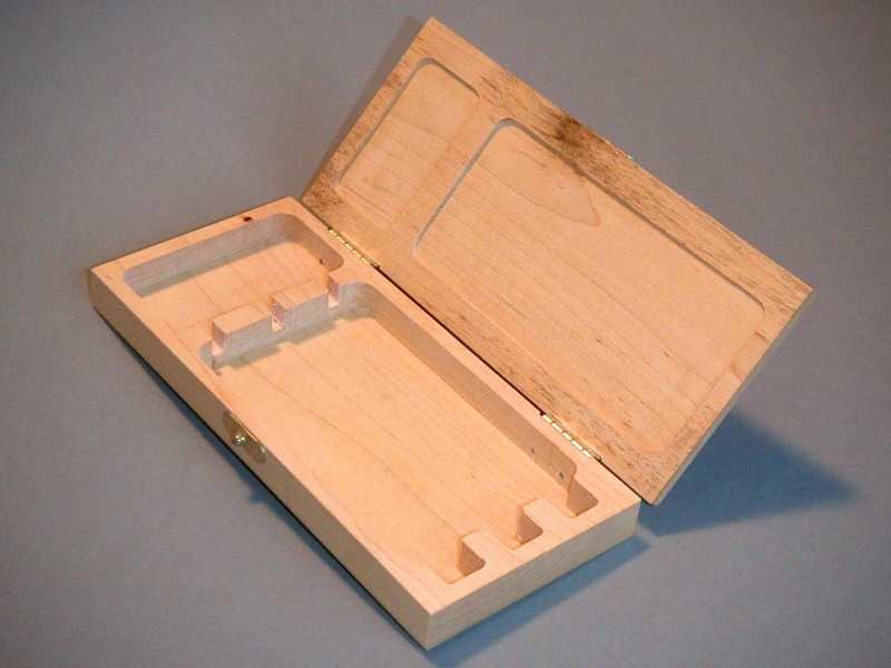 is. This box was made by milling out the cavity using Dremel bits in a drill press equipped with a cross vise, forming a sort of poor-man's milling machine. One thing I learned from making this box was how easy it was to mess up hinge mounting - a few thousandths of an inch off, and the lid is noticeably misaligned.