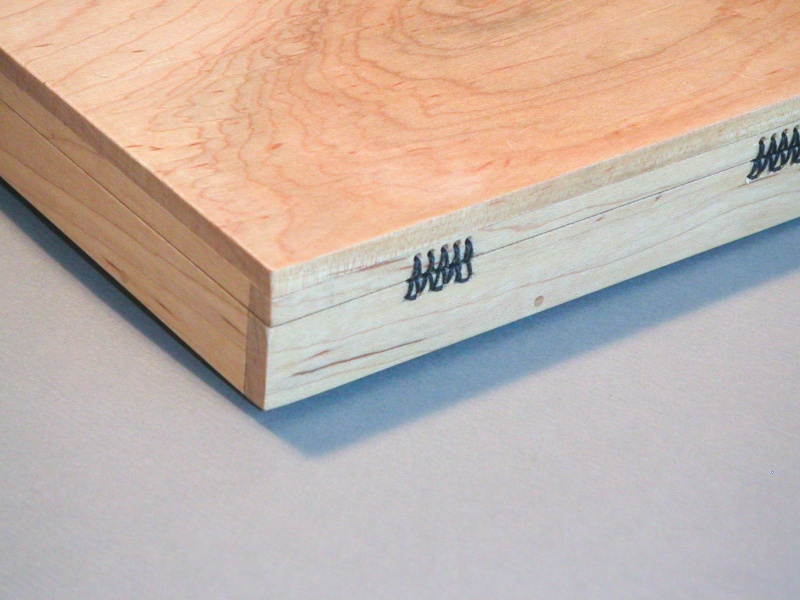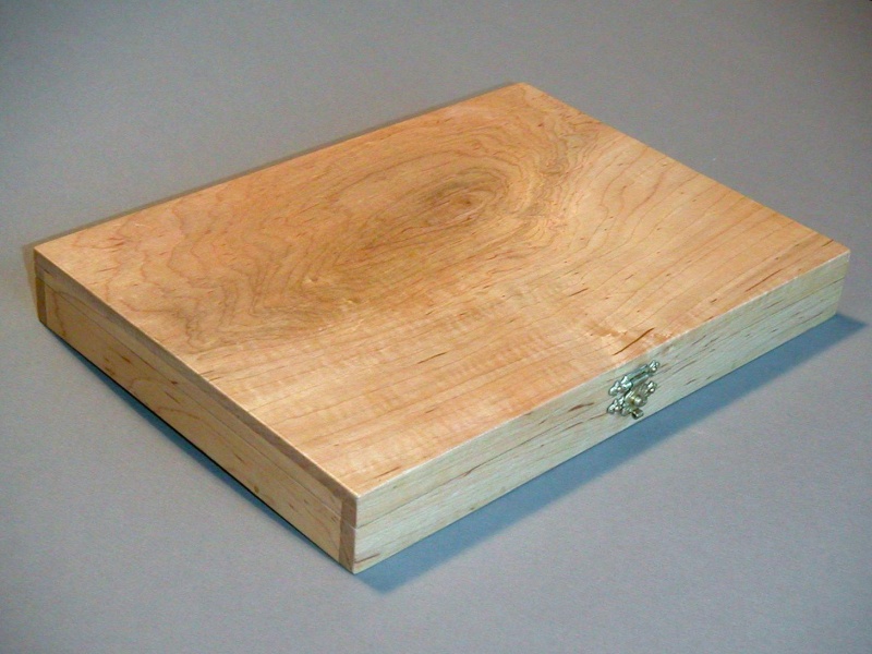 The larger flat box was made from Maple. The faces were pinned and glued together. For hinges I used Japanese shoji screen hinges as an inspiration. The hinges are formed by winding a thick thread through a series of holes, providing a friction-free 180 degree hinge (with no stinkin' screws to be misaligned). As you might expect, these hinges have a bit of give to them, so I included alignment pins on the corner of the box to ensure the lid mated accurately with the body of the box.