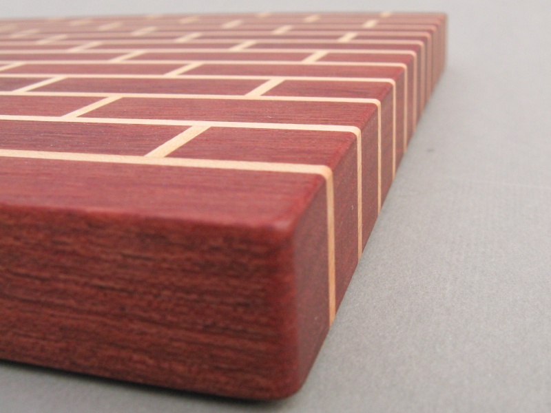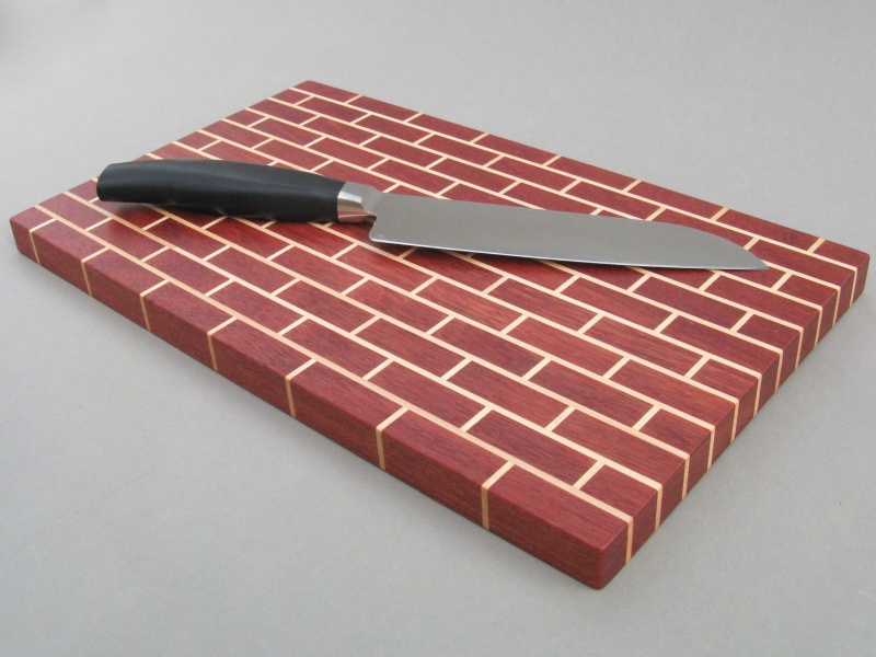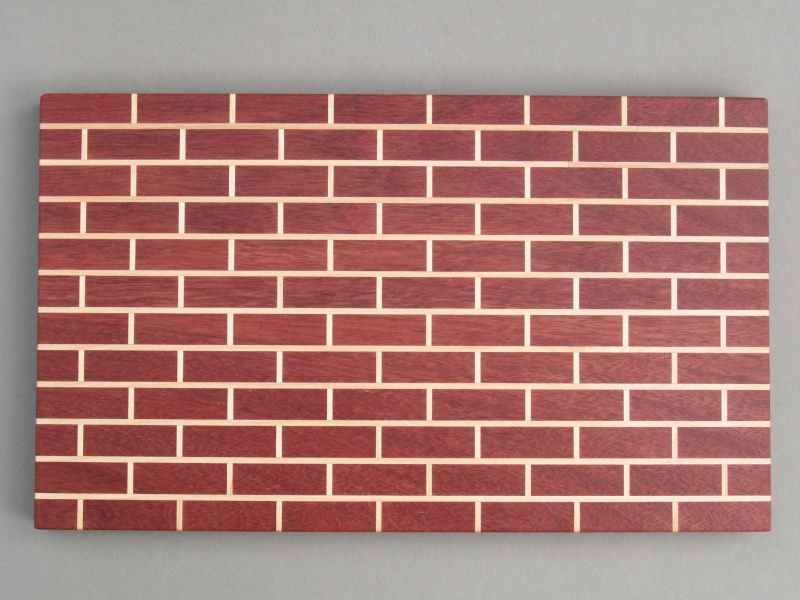 This breadboard (or perhaps cutting board or maybe charcuterie board depending on one's preferred activity/food) was made for a nephew who liked the brick design. The "bricks" are purpleheart separated with maple "mortar" and since purpleheart is a pretty heavy wood and the board is upwards of an inch thick, it has a pretty substantial heft.