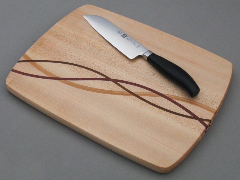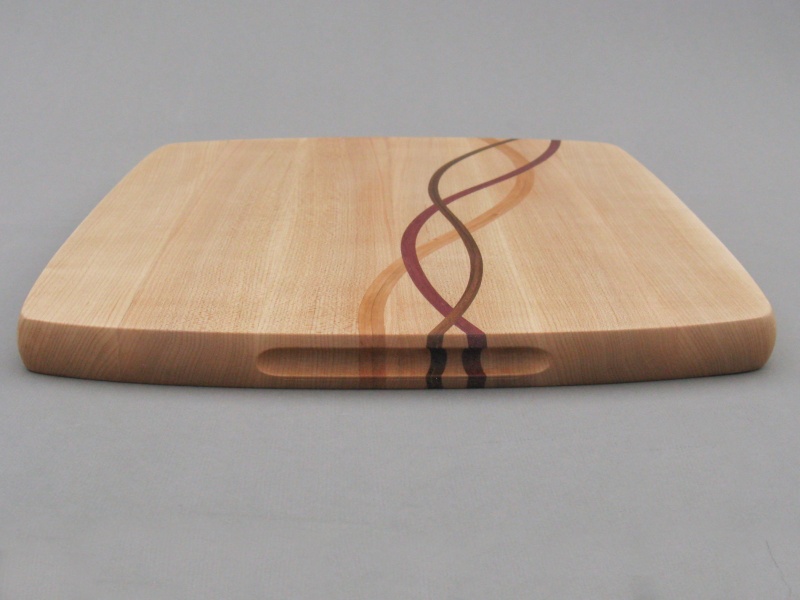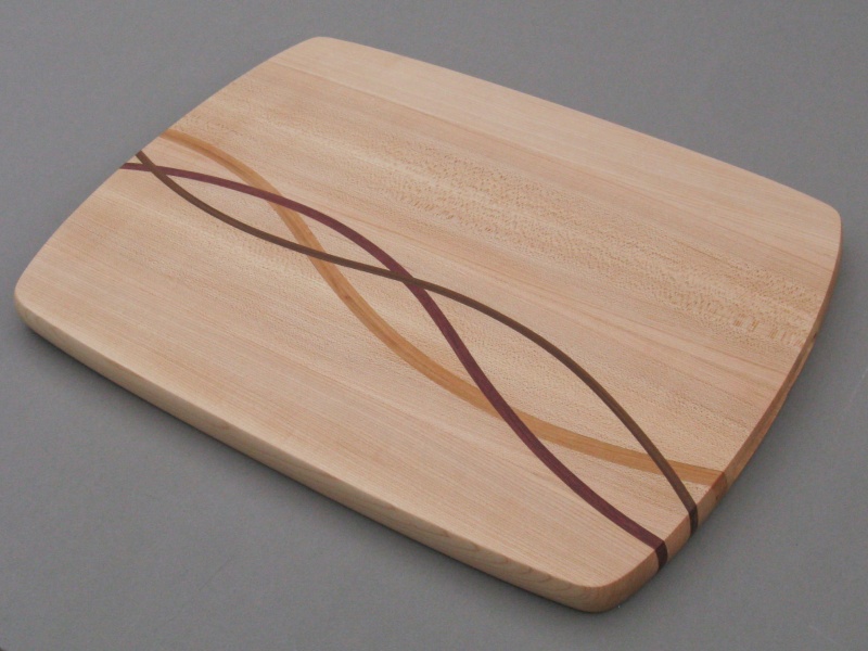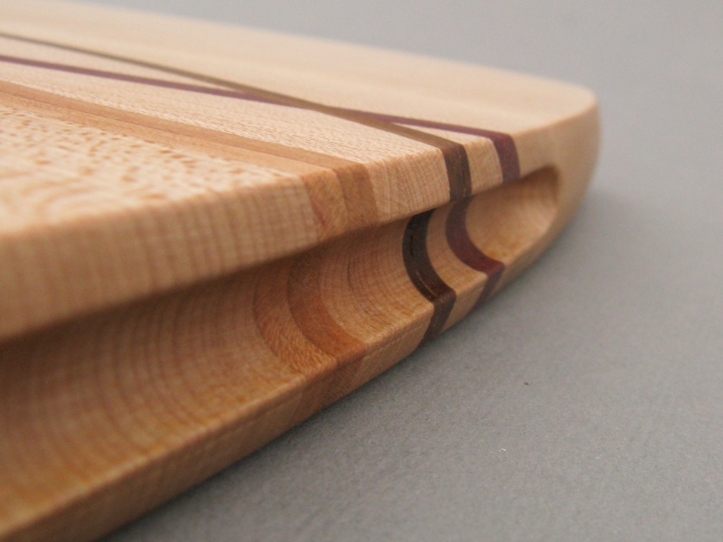 The body of this largish breadboard is formed from laminated quarter-cut maple planks, and incorporates contrasting strips of Purpleheart, Cherry and