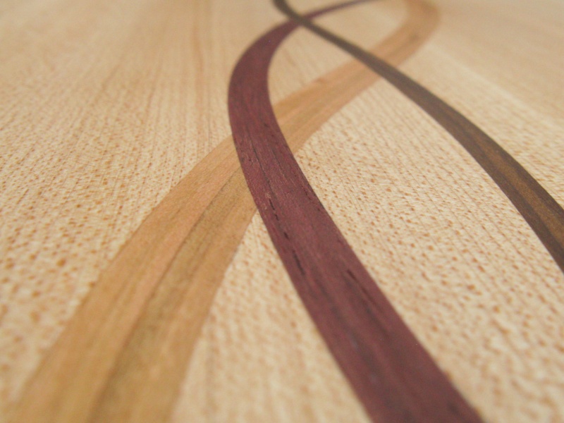 process starts with the full maple board and then a curved slot of the desired width is cut out of it. Thin strips of an insert wood whose total width is the same as that of the slot are then glued into the slot by compressing the board to squeeze and conform the strips to the curve. Once the glue dries, this process is repeated to incorporate each of the other two inserts.