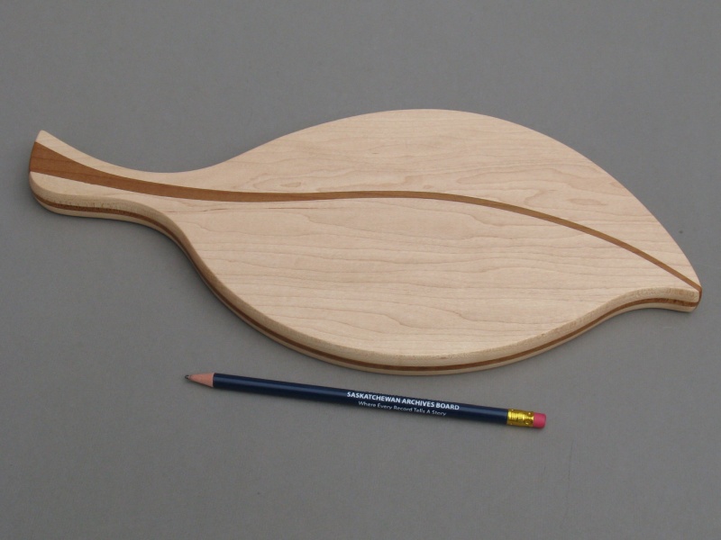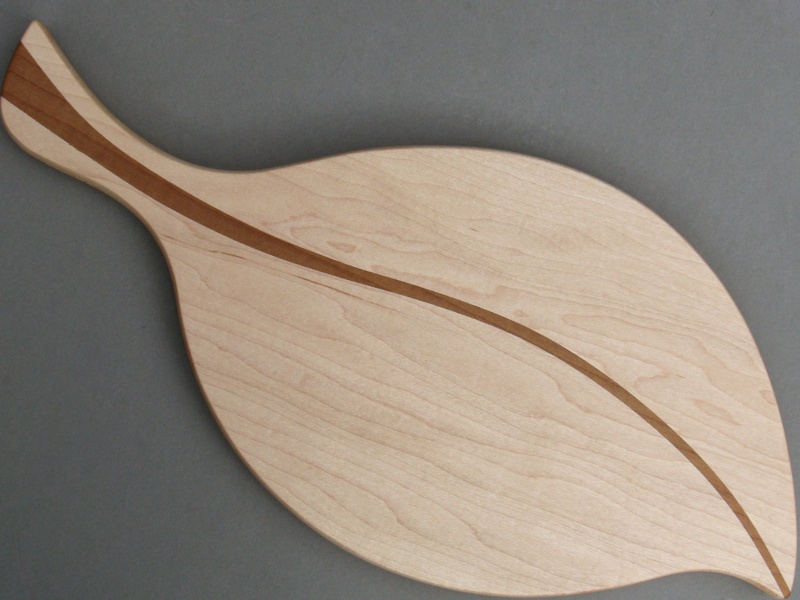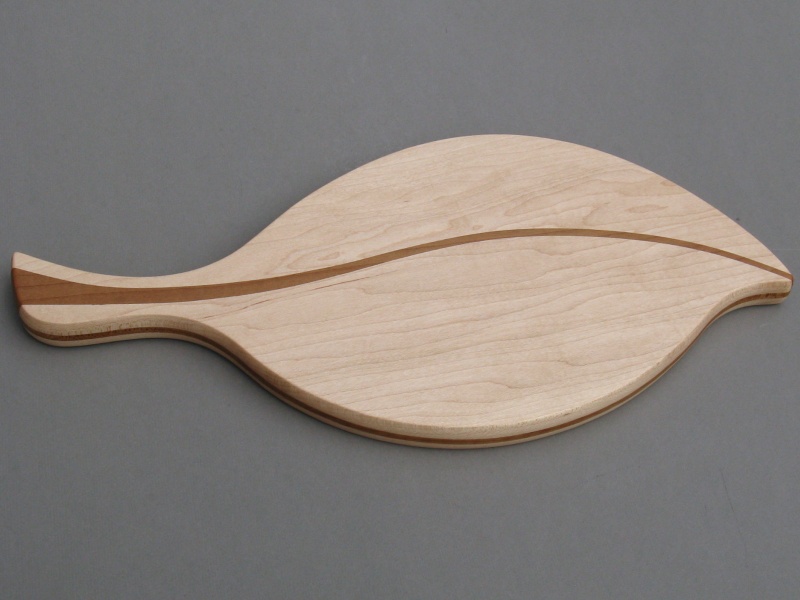The breadboard is all maple with the main body being the familiar light-colored Hard Maple while the center vein and edge trim are Roasted Curly Maple - the roasting process giving the wood the nice caramel color. Patterns were used to route the pieces with matching edges and then the individual pieces were