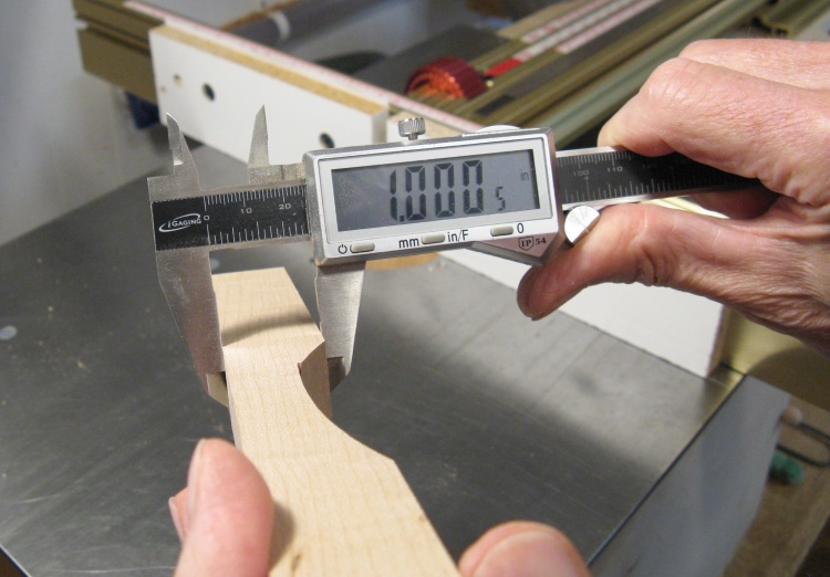 The width needed to be very accurate on these pieces so I jointed one edge to get it straight and then jointed all or parts of the opposite edge until it was parallel and the correct thickness. The piece shown is pretty close to the target of 1" although it was actually a couple thousandths thicker in other spots.