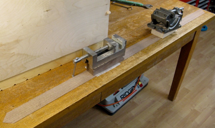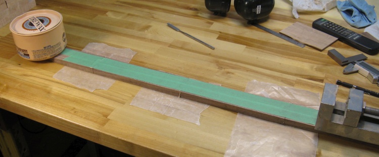 So I cut it into three pieces and glued them together to get a single, longer strip. In this photo the just-glued joints are weighted down with some convenient heavy things.