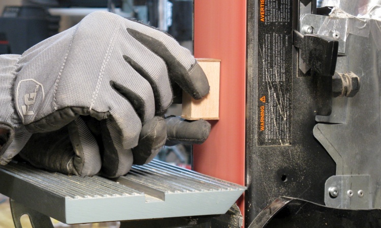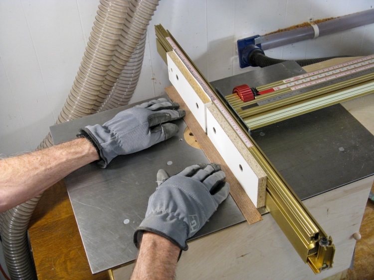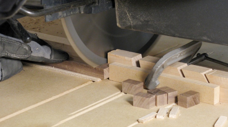 The thin strip of plywood under the walnut prevents splintering of the walnut as it is cut.