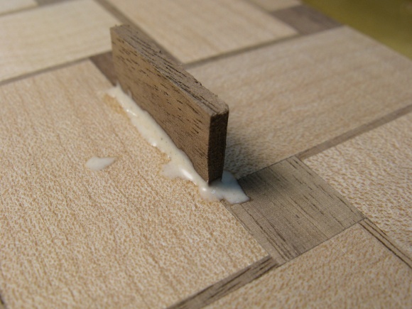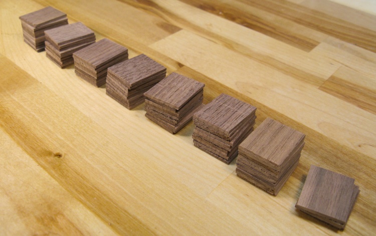 Next up was the thin shadow tiles. Rather than having to start from scratch, I found some thickish leftover walnut veneer I had made back in 2007 that would work just fine for the tiles (yes, that's why my wood shelves are rather crowded). I ended up using two pieces like this to get enough.