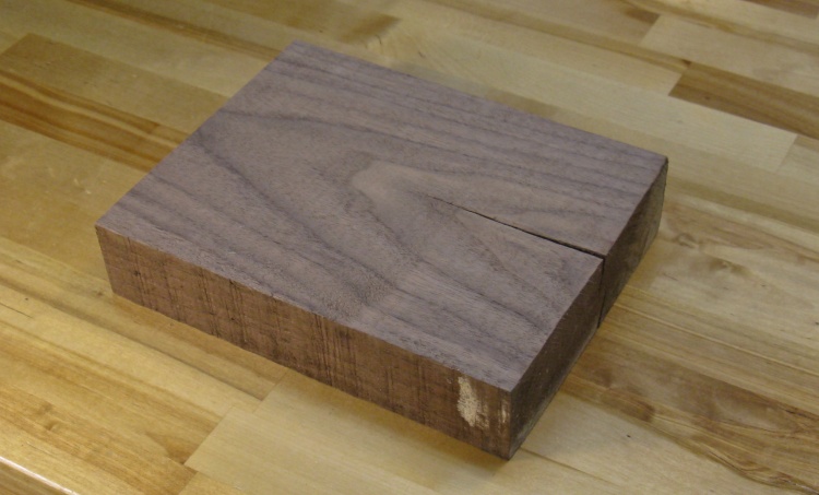 I selected this short walnut plank although I'm sorry to say I can't recall what it was left over from. It has a utility-limiting crack but since I'm going to cut it into tiny little pieces, that isn't going to be a big issue.
