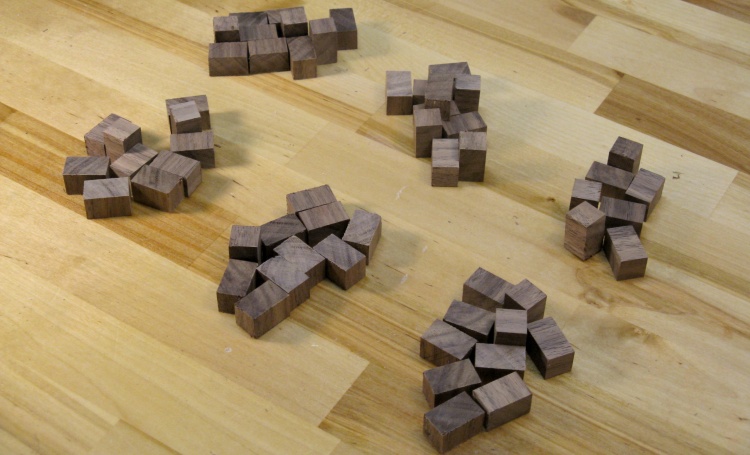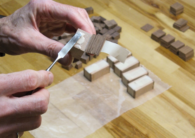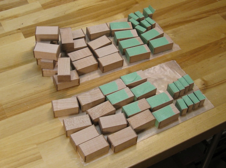 This was the result of the veneer work. Those of an obsessive-compulsive bent will protest that this photo shows only 74 tiles whereas I needed 80 (which in fact is true and due to some not-quite-thick-enough veneer sections) so I later processed another piece of veneer to get the remainder.