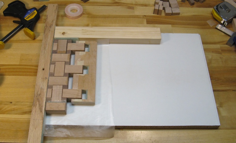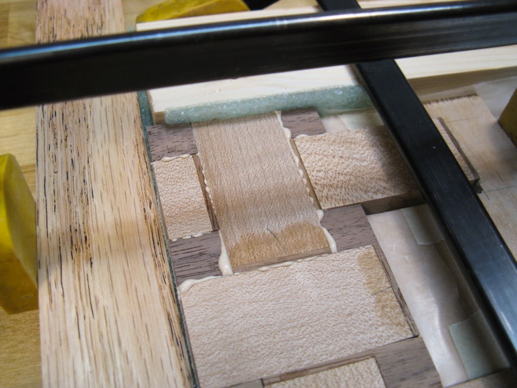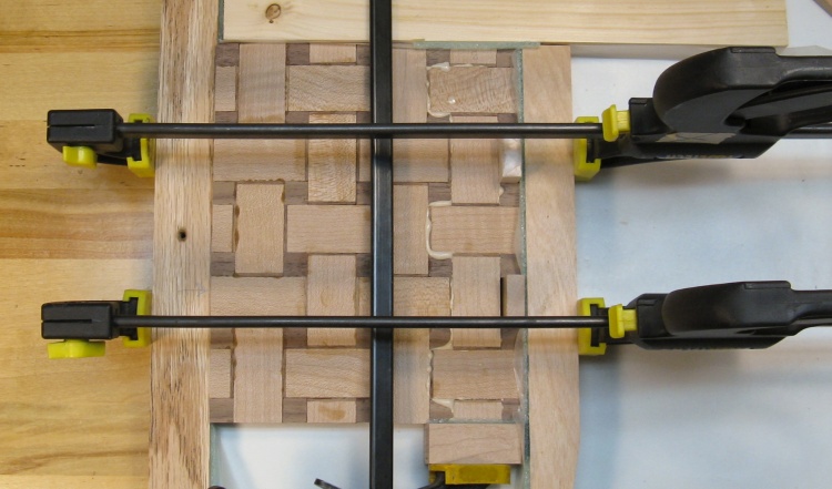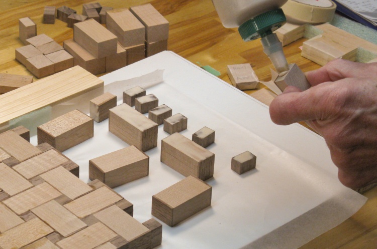 This photo shows the setup for gluing a row. The first stage is putting all the pieces in place and making any adjustments necessary like replacements, end-to-end flips, sanding, etc.