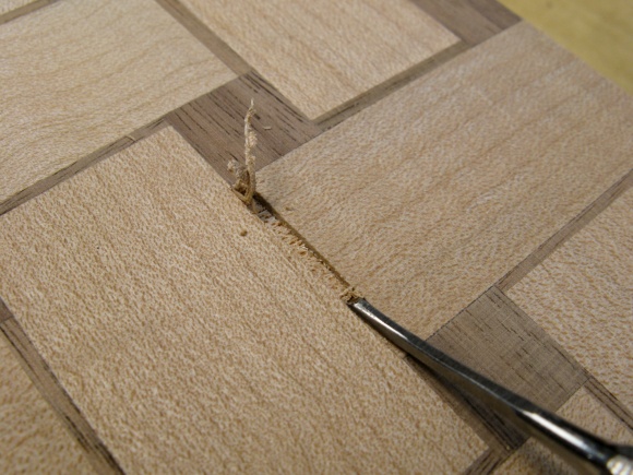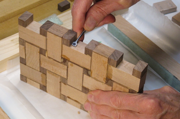 With the temporary spacers removed the glue needed to be cleaned out from the corners so the wool tiles of the next row would fit in properly.