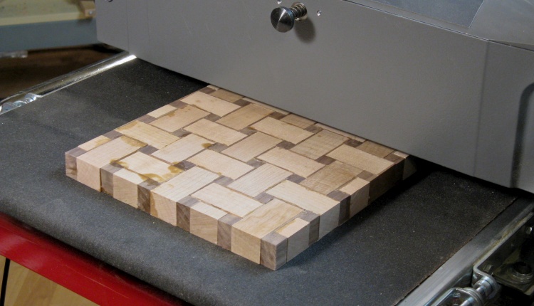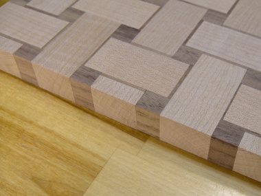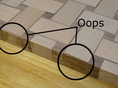 I managed to grab some incorrect pieces when doing the assembly and gluing and in one case, grabbed the right piece but put it in backwards. This particular class of boo-boo resulted in unwanted shadow pieces on the edge of the board. These were fairly obvious errors (to my eyes anyway) so they needed some fixin'. For these I simply sanded off about 0.07" from the long edges which removed the offending walnut but didn't change the look of the board noticably;