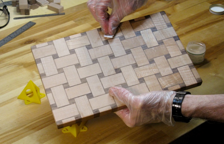 I used a food-safe wax to finish the breadboard, applied with a small piece of cloth. It then got polished after a couple hours of drying. That was followed with a second coat of wax.