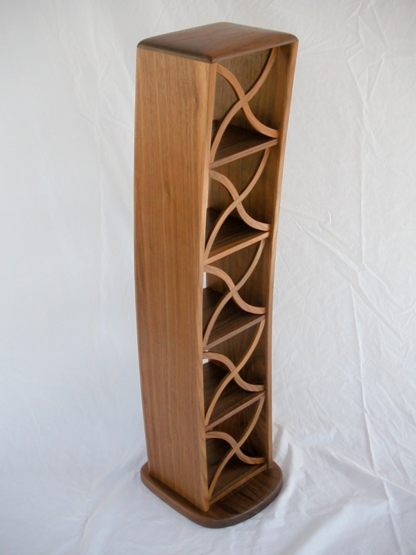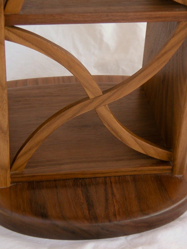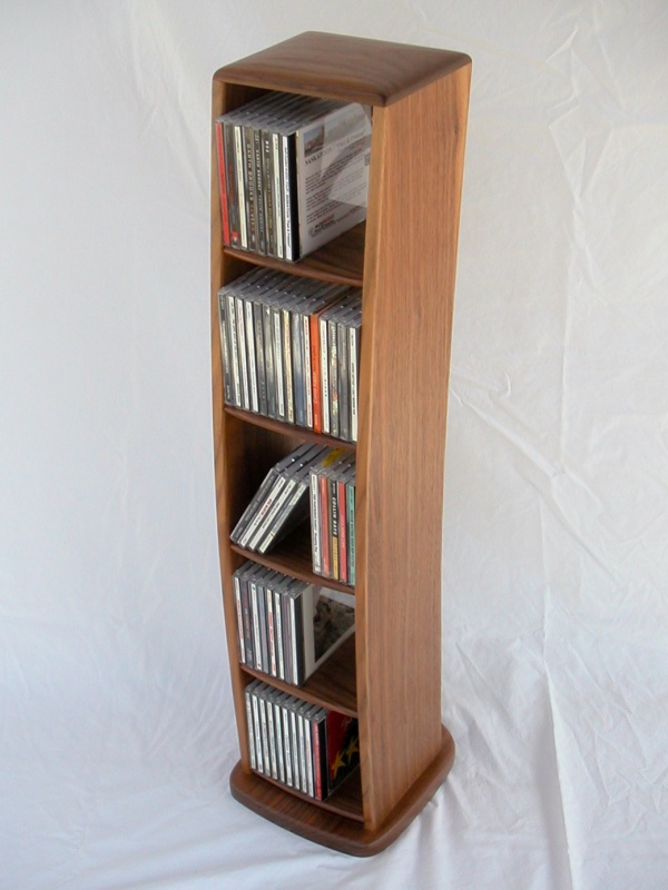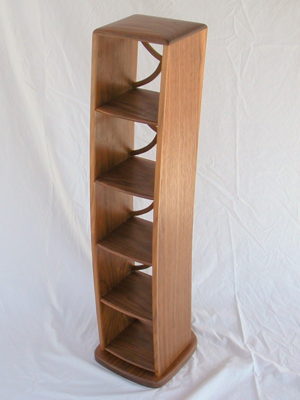 I had trouble finding a CD stand that we liked, so of course I had to make my own. I used walnut so that it would match the speakers in the stereo system. The sides are plywood with walnut veneer and edging, while the rest of it is solid walnut. I played around with different means of providing the backs for the shelves - I had decided I wanted them open. I finally ended up with the curved-cross shape based on aesthetics, manufacturability, and function. Of course, you can't really see them but I, at least, know they're there.