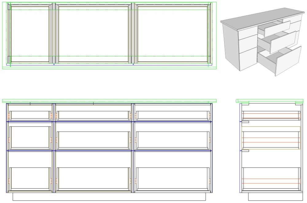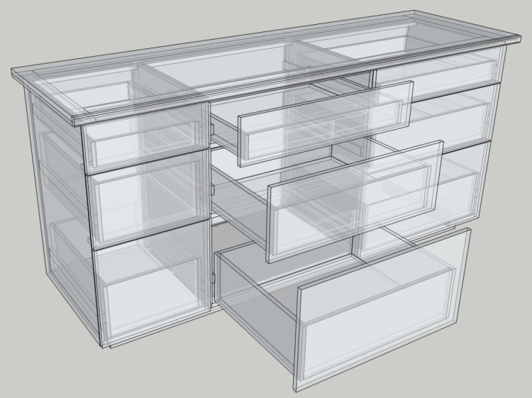 An "X-Ray" version showing the internal construction is always interesting so here is one of the complete cabinet (although I didn't bother adding the drawer pulls or slide details).
