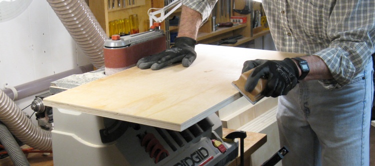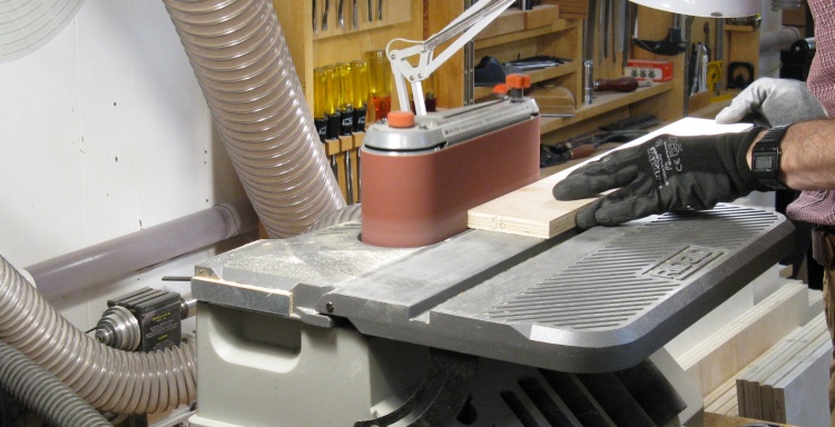 The saw left the edges fairly rough so any that would be visible after the cabinet was assembled were sanded smooth on the horizontal belt sander.
