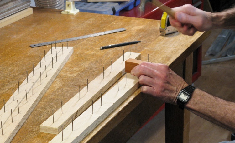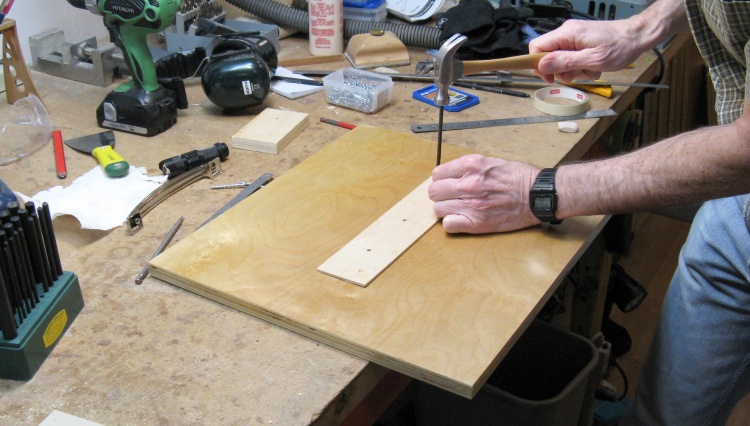 I had only enough of the plastic painting pyramids (the blue guys in the previous photo) to varnish four pieces at once so for the smaller pieces I made up a couple sets of simple finishing-nail stands that would support four or 8 small pieces each. This photo shows me completing the last of them, with the nail being pounded down (with a little 5 oz hammer) until the top is even with the wood block.