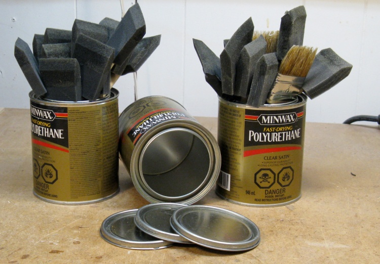 I started with the largest pieces and worked downward in size with this photo showing a couple of cabinet backs getting a coat of varnish. I would do both sides and any required edges in one session and position the pieces on small plastic stands for drying.