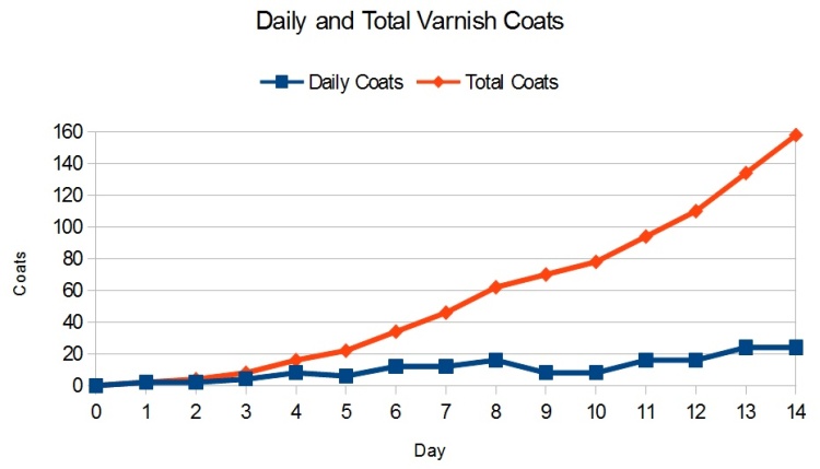 Overall it took two weeks of once or twice-daily varnishing sessions as the graph clearly illustrates.