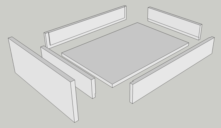 This sketch shows how the six drawer pieces are going to fit together. The bottom is recessed into the edges to avoid visible vertical seams and the front and back also fit into the sides.