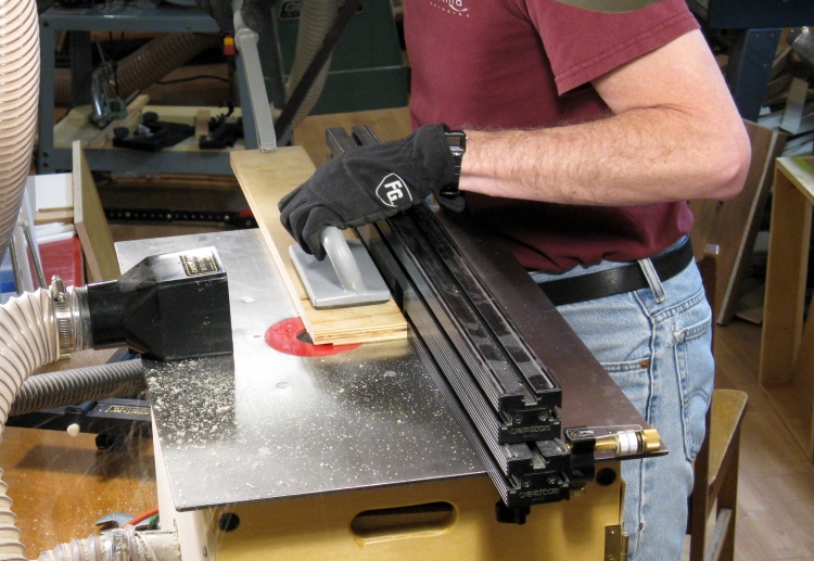 This is the sort-of-backwards routing setup I used for the drawer edge pieces. It puts the top edge of the routed section a fixed distance from the top of the piece. That way the top of the edges should all be the same distance above the bottom piece even if there are differences in drawer edge heights.