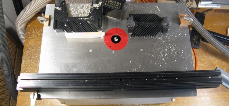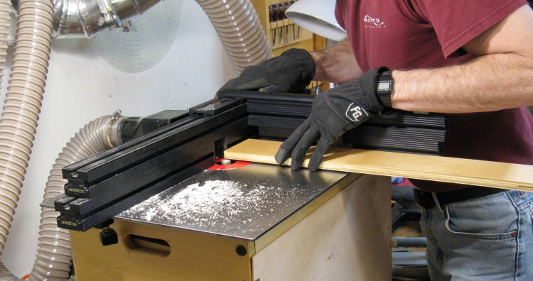 I added some featherboards to help hold the wood against the fence as shown in this picture. The left featherboard is modiified with a piece of wood since the "feathers" go the wrong direction when the wood is moved from right to left.