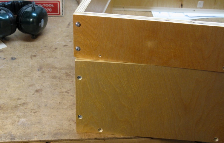I screwed a couple drawers together - one with countersink holes and one without - to compare the looks. The countersunk version (lower drawer) looked a bit more finished, so I went with that technique.
