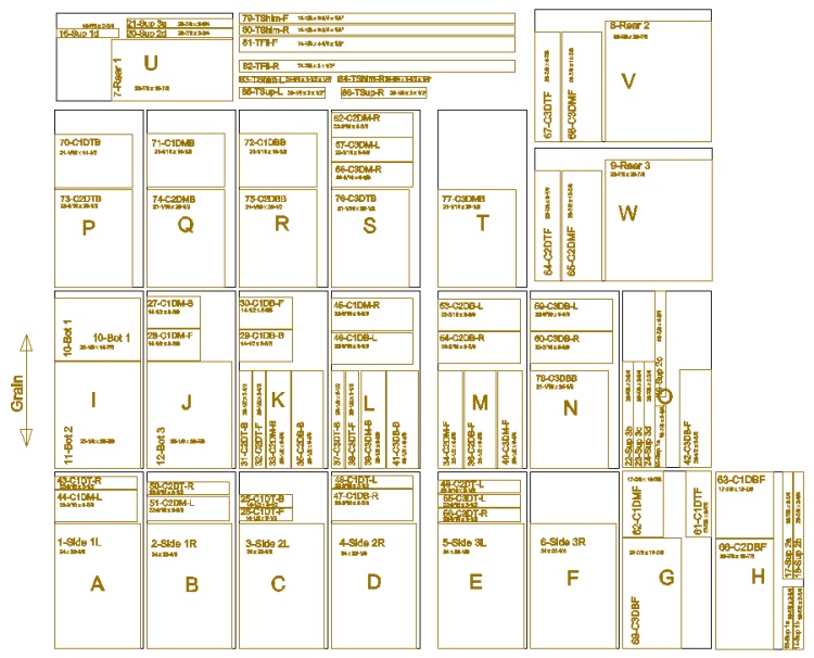 This diagram shows the 24x48-inch pieces (plus a couple at 30x48-inch) with the individual cabinet parts and dimensions indicated on them.