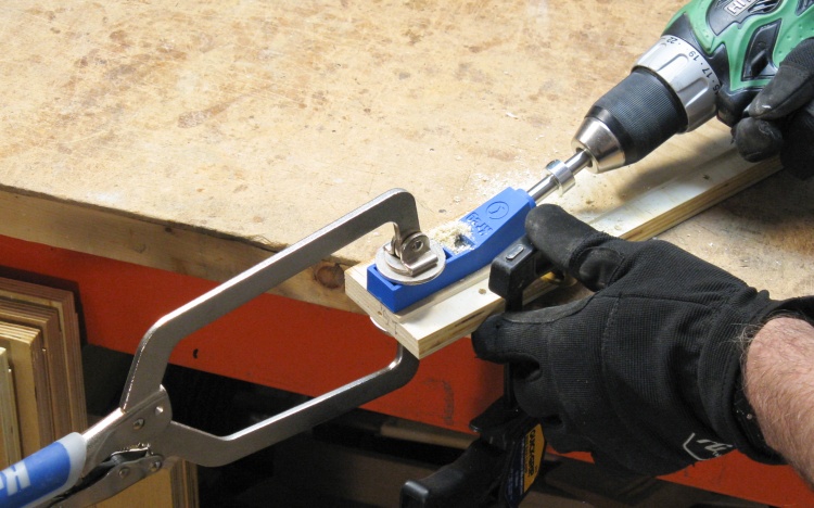 This blue jig allows the hole for the screw to be drilled at an angle into the face of the wood. It uses the stepped drill bit that made such a lousy hole shown previously, but works fine in this application.