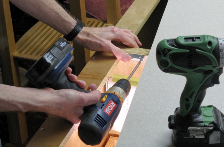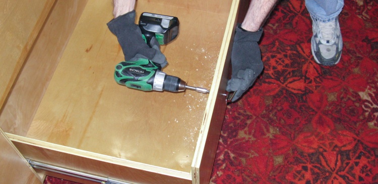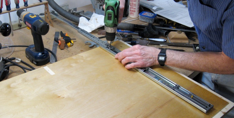 I pulled one side off the cabinet again to make it easier to install the slides. Here the first one is being screwed into place.