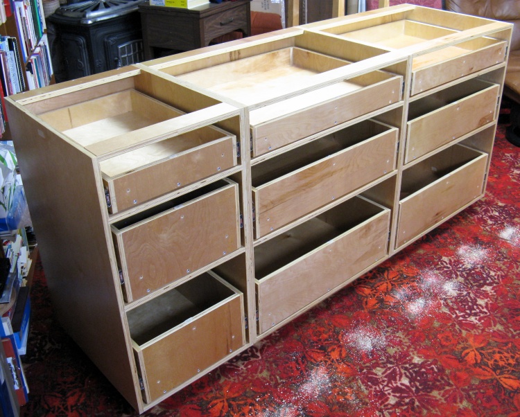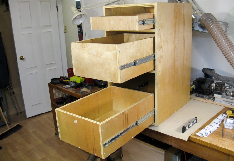 Here's the completed set of drawers, pretty much blocking off my access to tools. They still need the fronts added but that needs to wait until after cabinet assembly.