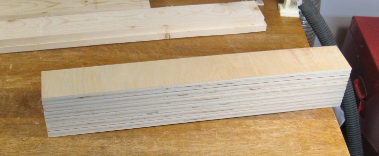 In order to have the base match the cabinets, I cut up some plywood scraps to laminate onto the three exposed sides of the base. Here a half-dozen pieces have been cut to width for that purpose.
