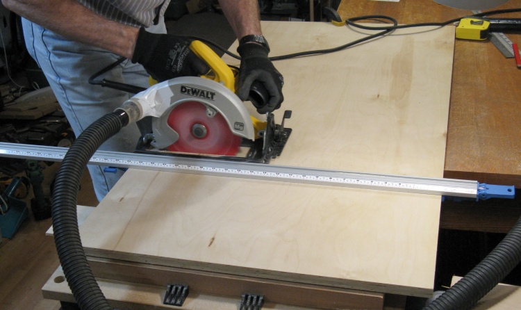The shot above shows the plywood being sawn in the same direction as the grain of the outside veneer, which produces a nice smooth cut. By contrast, making a cut across the grain direction results in splinters. To minimize those, I added masking tape to the bottom side of the board along the route of the cut.