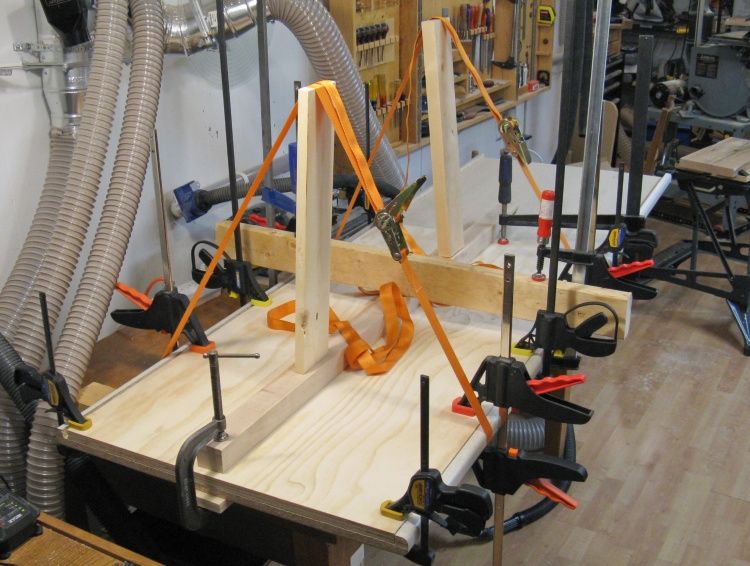I used a center brace which was forced downwards with the orange tie-down straps on the vertical wood pieces. I tightened the straps until the top was flat and then let the glue dry.